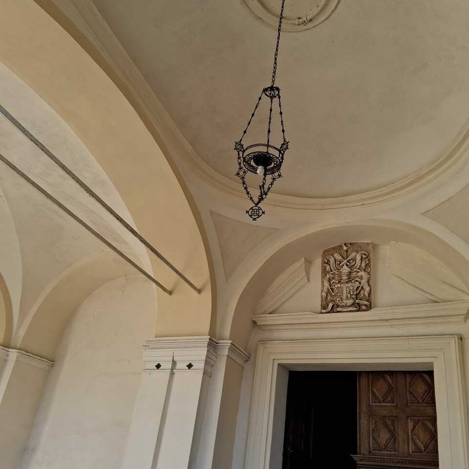 Sotto la volta centrale del porticato brilla una lampada votiva in ferro battuto: le madri di Pont che videro partire i loro figli per la Prima guerra mondiale la offrirono a Santa Maria per invocare la Sua protezione.