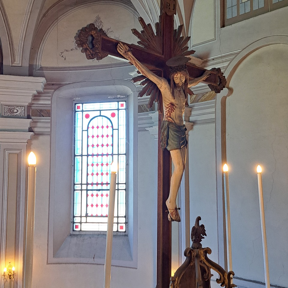 Nell'area presbiteriale, sopra il tabernacolo barocco è collocato il crocifisso ligneo, della metà del 1400, recentemente attribuito alla bottega pavese dei Da Surso, Urbanino e Baldino.