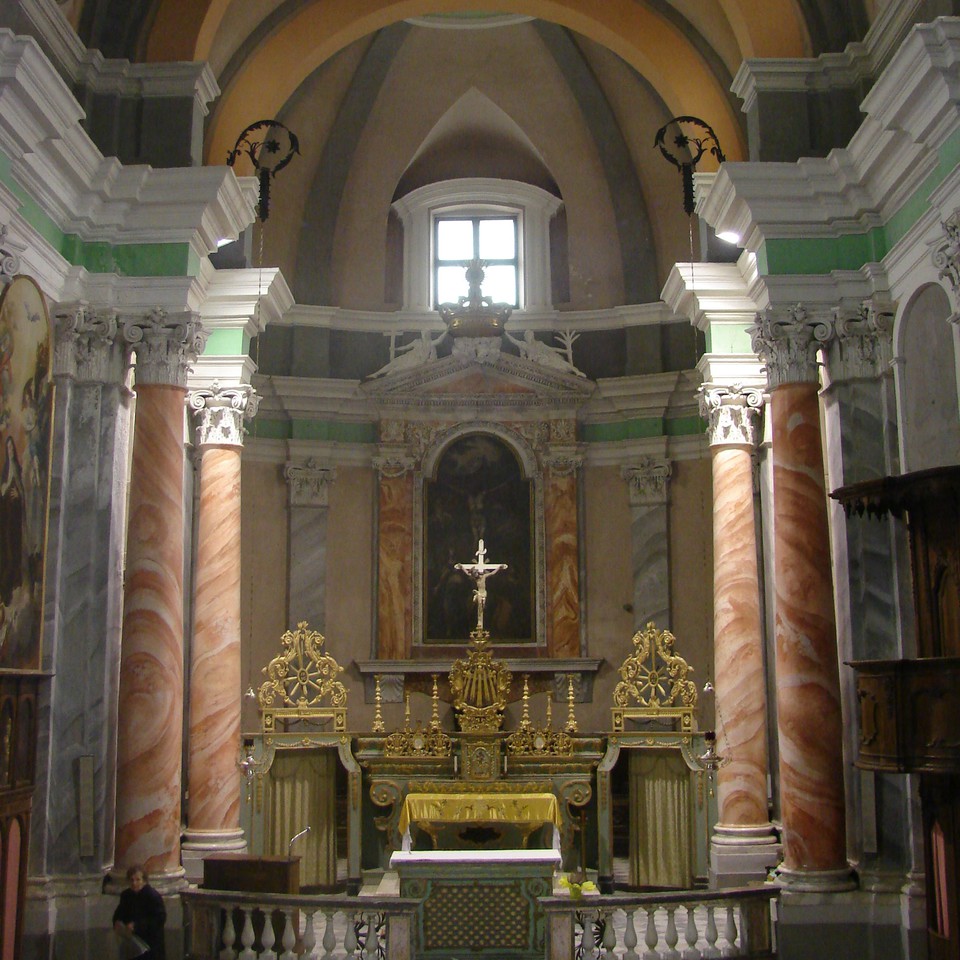 L’altare maggiore è interamente costruito in legno scolpito e dorato con motivi decorativi che ne esaltano la luminosità e nello stesso tempo la sobrietà. Sulla porticina del tabernacolo sono scolpiti elementi e simboli eucaristici.