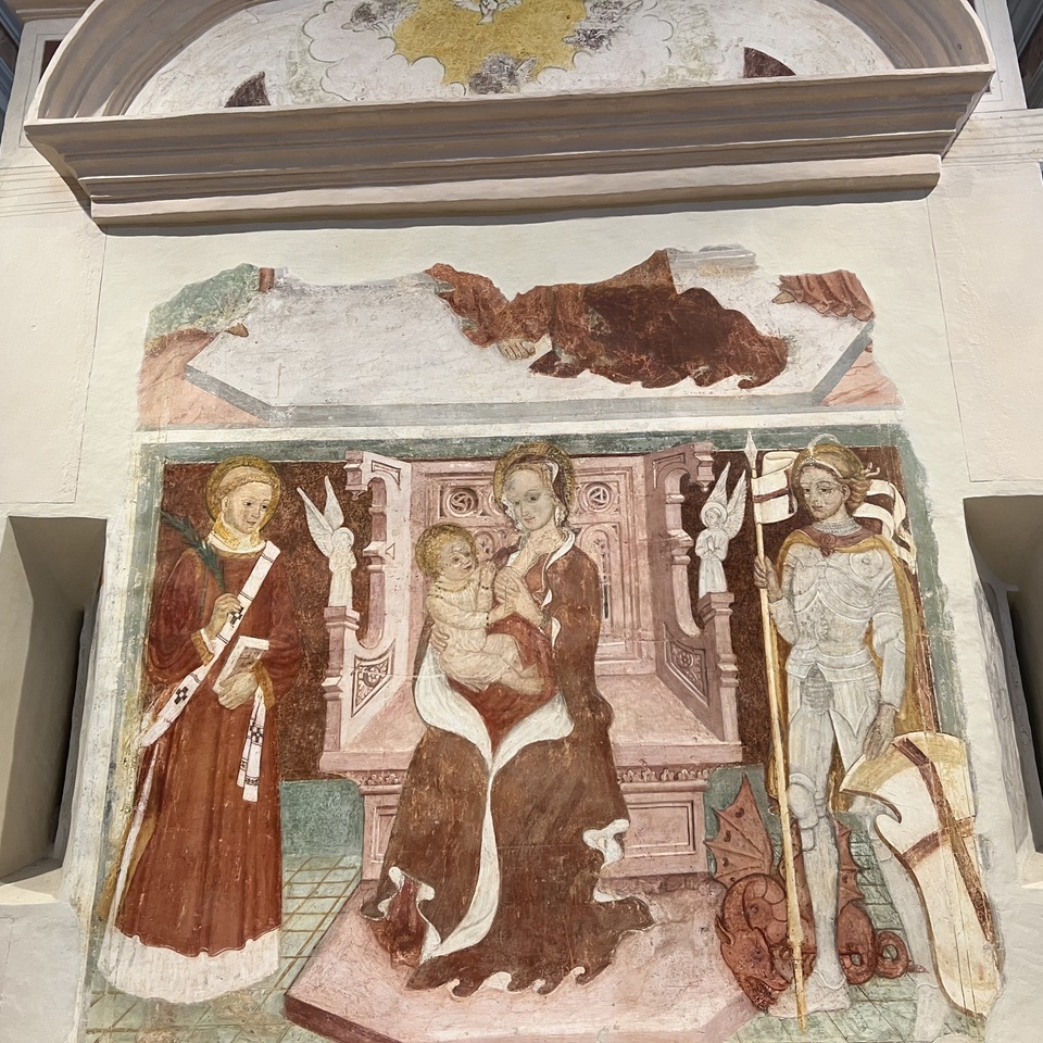 L’affresco raffigura la Madonna in trono nell’atto di allattare il Bambino che ha in grembo. A lato si possono osservare due piccoli angeli poggiati sul pomo del trono e due Santi in posizione eretta: san Giorgio, patrono di Niella Belbo, e santo Stefano.