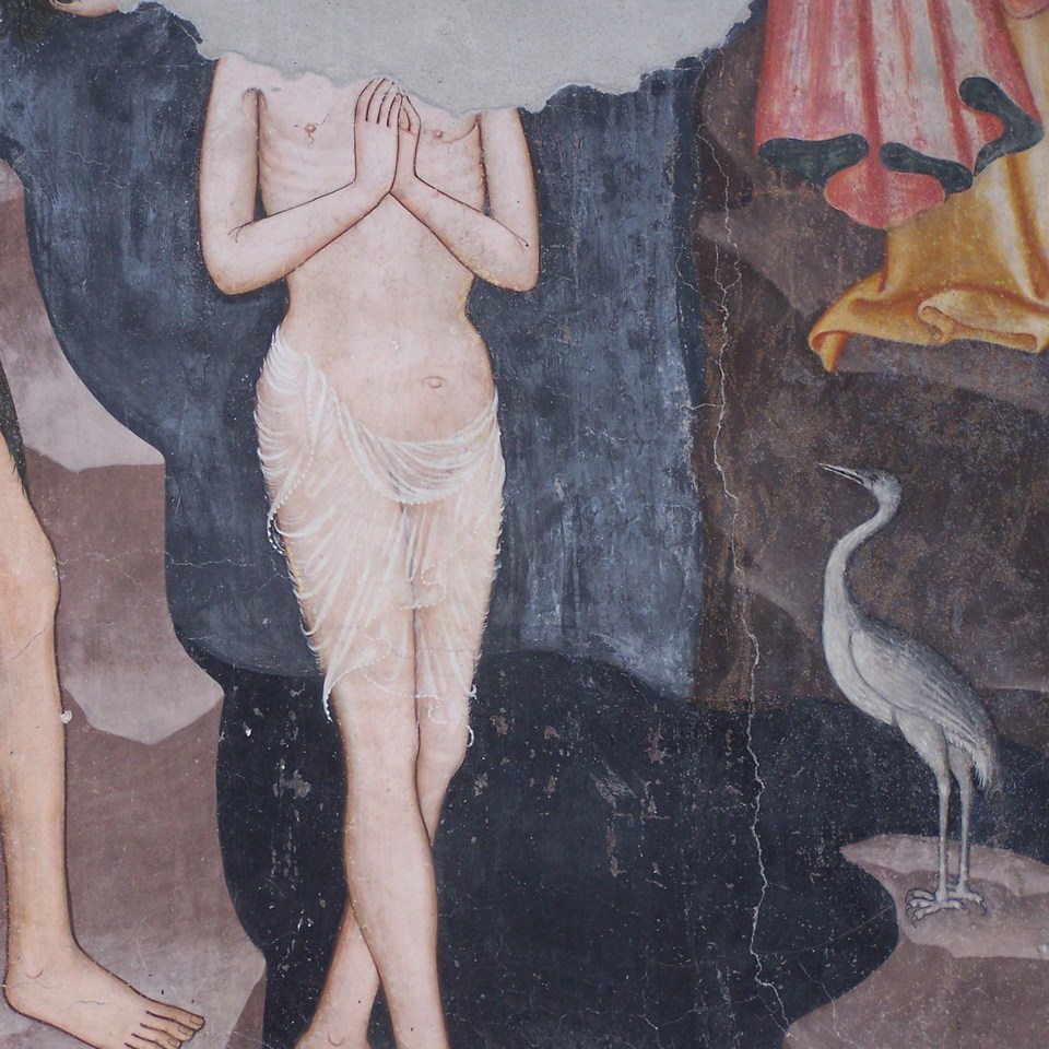 Nella parete del battistero un frammento di affresco incorniciato ad ancona di altare, rappresenta il Battesimo di Gesù a cui assiste un elegante airone cinerino ritto sulle rocce del Giordano.