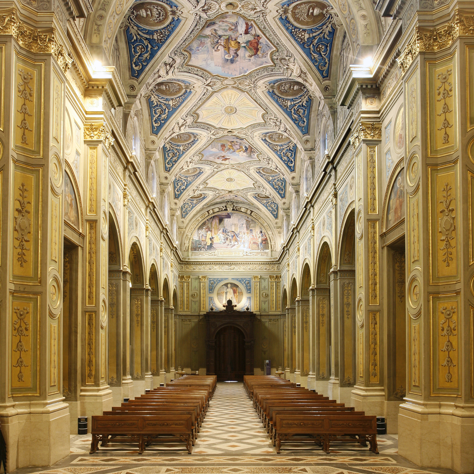 La cattedrale di Alessandria, posta al centro della città, sorge sul luogo di un edificio costruito in stile gotico lombardo abbattuto nel 1803 per esigenze militari da Napoleone Bonaparte. Il capitolo, nel 1805, otteneva dallo stesso Napoleone la chiesa trecentesca di San Marco, per la quale fu necessaria una ricostruzione (1807-1810) su disegno dell’architetto Cristoforo Valizzone. Si ebbe così una chiesa di stile neoclassico in contrasto con le parti conservate, ossia il voltone della navata centrale e le colonne. Il doppio stile fu eliminato fra il 1874-1879 con l’architetto vercellese Edoardo Arborio Mella (1808-1884), giungendo all’attuale architettura in stile bramantesco con una cupola nell’incrocio dei due bracci del transetto. L’attuale decorazione risale al 1926-29, affidata a Luigi Morgari di Torino (1857-1935), mentre l’altare maggiore risale al 1954. Abbelliscono il presbiterio 5 vetrate istoriate (1954) che raffigurano la Vergine Immacolata, S. Pio V, S. Baudolino, S. Paolo della Croce, il Beato Gregorio Maria Grassi. Completa il tutto l’organo (1929), le cui facciate ornano i quattro matronei sovrastanti il presbiterio. Dietro l’altare maggiore si può ammirare il coro settecentesco in legno intarsiato, su cui campeggia un magnifico quadro di Callisto da Lodi (1546) rappresentante S. Pietro tra i Santi Paolo e Giovanni Battista. All’esterno, la facciata è in stile neo-classico con colonne d’ordine corinzio. I dipinti che la abbelliscono rappresentano S. Pietro liberato dal carcere, S. Pietro riceve le chiavi, S. Pietro va incontro a Gesù sulle acque del Lago di Tiberiade, opera di Luigi Vacca di Torino (1771-1854). Nel timpano, lo stesso Vacca rappresentò l’Eterno Padre, mentre sull’attico 5 statue in marmo rappresentano il Redentore e i quattro Evangelisti. Sul lato sinistro della facciata esiste un monumento a Gagliaudo, appartenente al vecchio duomo, personaggio leggendario che durante l’assedio del Barbarossa ad Alessandria avrebbe salvato la città (1174).