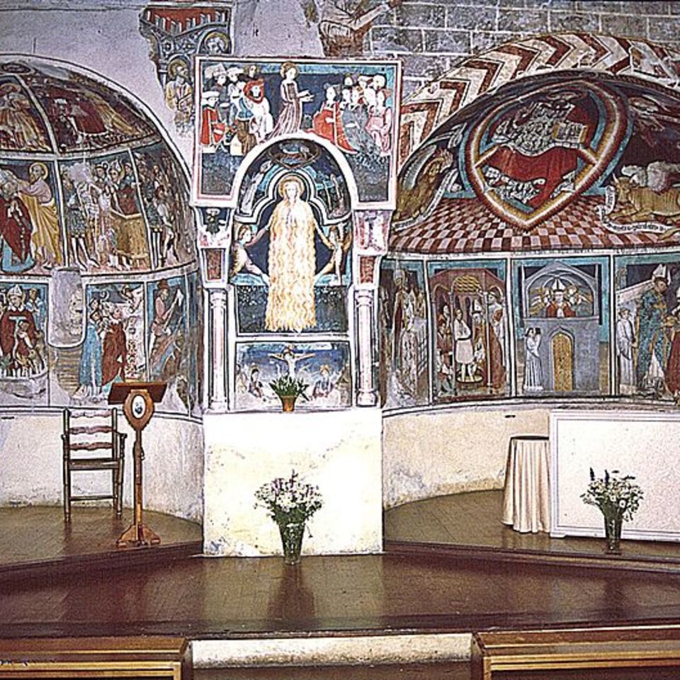 La data 1451, riportata da un’iscrizione, fissa l’esecuzione della sontuosa decorazione pittorica che riveste le due absidi, la nicchia centrale e le due pareti della navata. Attribuito ad un anonimo artista piemontese al quale è stato dato il nome convenzionale di Maestro di Lusernetta, il ciclo è dedicato alle vite e gesta dei santi Denis, vescovo di Parigi, ed Erige, vescovo di Gap. Nella nicchia tra le due absidi, sormontata da un baldacchino in muratura, due angeli sostengono Santa Maria Maddalena ritratta a figura intera, completamente avvolta dai lunghi cappelli dorati. Attivo sui due versanti delle Alpi intorno alla metà del Quattrocento, l’artista rivela ancora legami con il linguaggio tardogotico e si caratterizza per la creazione di sovrabbondanti panneggi e l’uso di decorazioni a stampino in particolare per le vesti, oltre che per eccentriche notazioni caratteriali e tentativi di resa monumentale delle figure.